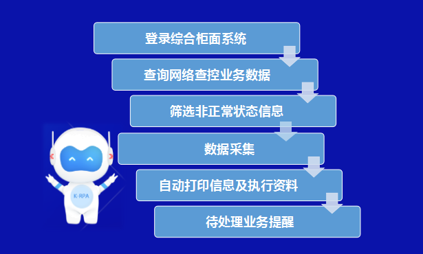 RPA能够实现每天自动定时查询网络查控业务处理情况,发现非正常状态的发出待处理提示,同时打印详细信息及有关执行资料。减少人工操作,释放生产力。