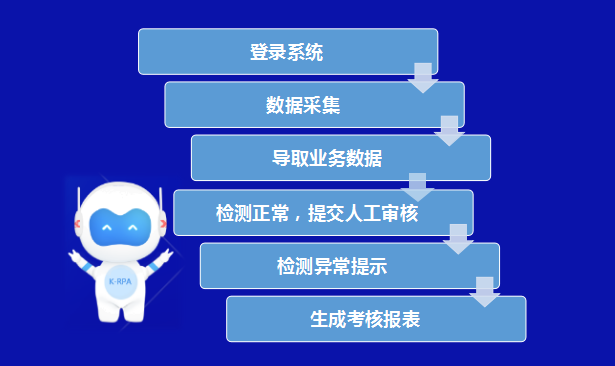 人工设定各类KRI指标统计的口径;由RPA进入相应的系统导取业务数据;对所导取的数据进行检测,看是否在正常值范围内,若为阀值内则提交人工审核;若阀值外(或存在其它异常)时则作出提示并提交人工审核;填列相关考核表,人工报送。