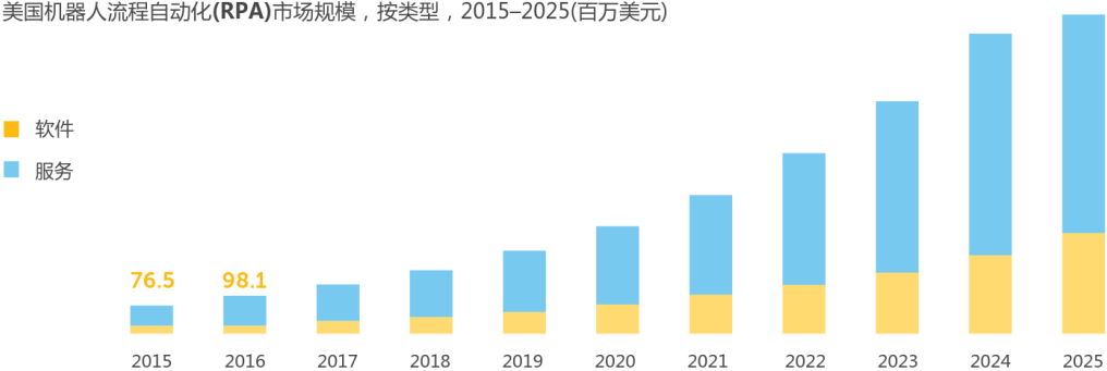 RPA的迅速普及也就不足为奇了。预计到2023年,在RPA软件上的花费将达到86亿美元,从2018年到2023年,复合年增长率为36.2%。根据Everest Group的说法,如部署RPA的企业客户端数量所示,从2016年到2017年,采用RPA的企业增长率达到105%。
