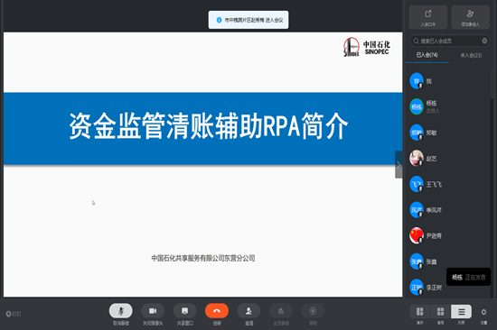 在该RPA推广方面,他们精心编制培训课件,积极协调推广事宜, 4月10日,为山东石油公司济南、潍坊、德州、菏泽四个地市分公司开展了RPA的推广使用视频培训, 80余人参加了培训。本次培训,技术业务部高级工程师杨栋讲解了RPA初识、资金监管清账RPA的功能和使用,安装及常见问题。培训过程中,试点单位东营石油分公司的财务负责人陈树栋说:“以前说到用RPA实现清帐,我觉得是实现不了的,那不把帐清乱了吗?没想到如今RPA用起来还是很方便的,它清的每笔帐都有记录,降低了业务风险,规则设好了,也不会出错”。