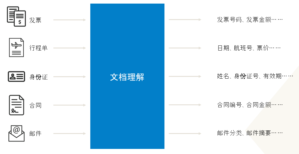 所谓文档理解,指的是利用UiBot Mage提供的AI能力,将现实生活中常见的非结构化文档,例如发票、行程单、身份证、合同、邮件等,进行解析和理解,并将该过程集成到完整的业务流程中,助力RPA+AI行业解决方案。