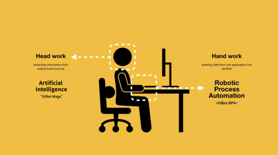 RPA模拟人的双手,例如点鼠标、敲键盘,将数据从一个系统录入另一个系统的机械重复工作,解决流程自动化;