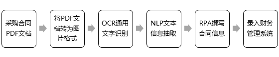 合同识别场景是一个典型的文档理解助力RPA+AI行业解决方案的实例。其中,合同电子化利用扫描仪和高拍仪进行;PDF转换成图片由RPA引擎模块完成;OCR通用文字识别模块完成合同图片到文字的转换;NLP文本信息抽取模块将合同关键信息抽取出来;最后,利用RPA的UI自动化技术将合同信息录入财务管理系统。