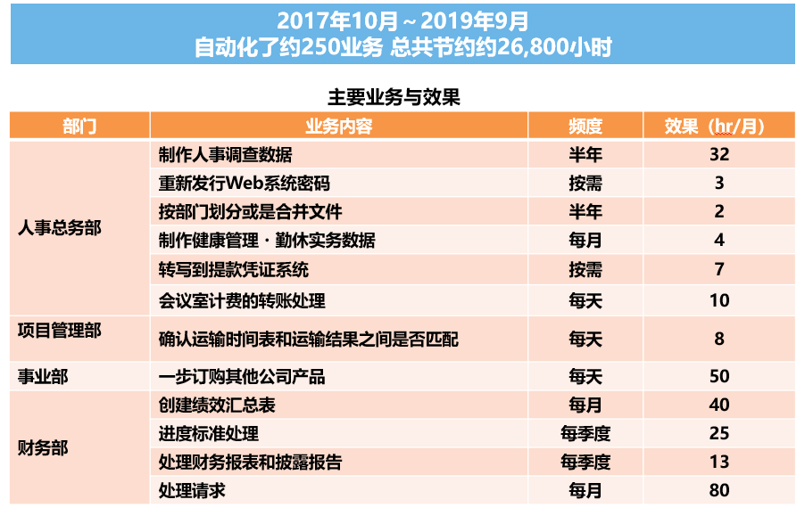 在中国,日立RPA也被运用在顾客及合作伙伴的人力资源,IT,财务、销售等部门,凭借精准高效的计算能力,帮助员工从复杂且单纯的工作中解放,进而实现工作量的优化提升。