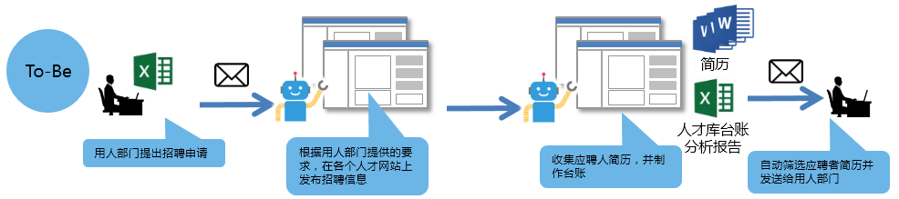 一个岗位招聘,从发布招聘信息,到确定面试人选往往要经过数道流程,意味着HR需要付出数百小时的时间,而这其中相当一部分都是繁琐重复的工作。日立RPA可以自动生成并发布招聘信息,高效处理简历和在线申请表的收集与筛选,进行彻底的后台验证核查,并使用BotInsight功能将信息与岗位要求进行比较,最终准确提供符合条件的候选人。