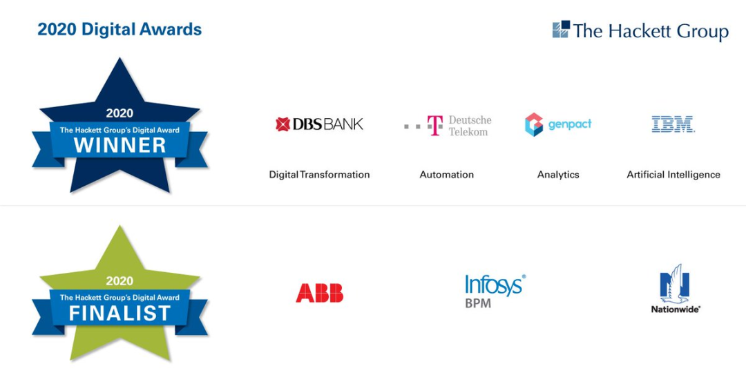 今年的获奖者分别是:IBM(IBM Watson智能自动化)、星展银行(数字化转型)、德国电信服务公司(数字化转型)和简柏特(智能数据分析);此外,还有三家企业入围了决赛评选阶段,分别是,ABB(数字化转型)、Infosys BPM(RPA)和Nationwide(数字化转型)。