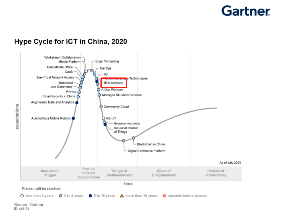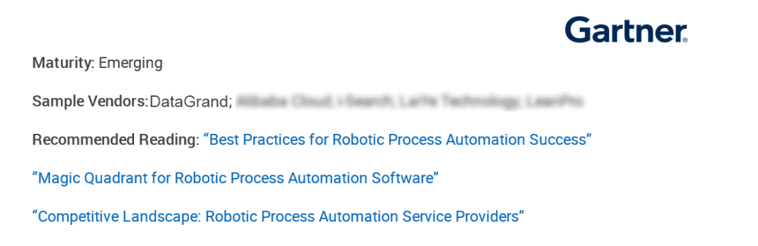 在2020技术成熟度曲线报告中,RPA已发展为逐步成熟的技术,人们对其的兴趣也急剧上升。Gartner指出,在中国本土RPA市场上,以达观数据(DataGrand)为代表的国内一批自动化先行者是强有力的本土竞争者。