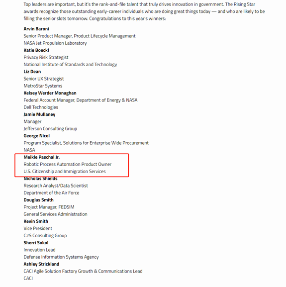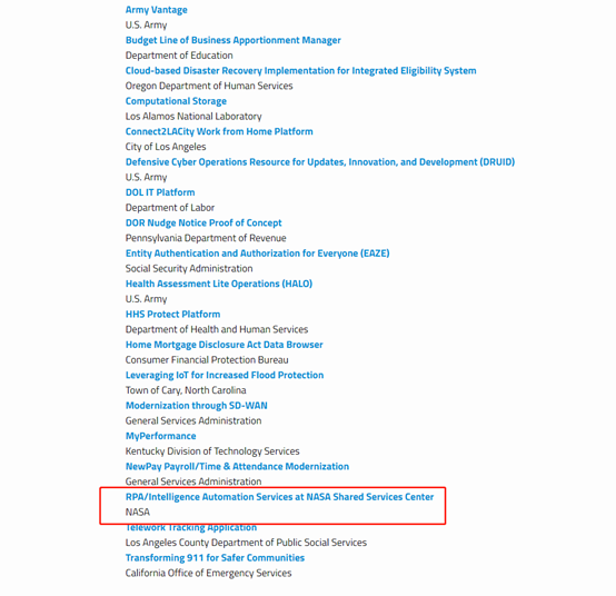 其中,美国国家航空航天局(NASA)共享服务中心的RPA项目,被评为“政府公共部门创新奖”;美国移民局RPA产品负责人Meikle Paschal Jr,获得了“技术创新者”的称号。