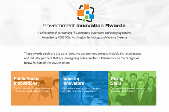 近日,由华盛顿科技、FCW、GCN和美国国防信息部经过层层筛选公布了2020年“政府公共部门创新”、“行业创新”和“技术创新”三项大奖。这些奖项表彰了那些为政府公共部门的IT变革和数字化转型做出突出贡献的部门和杰出人才。