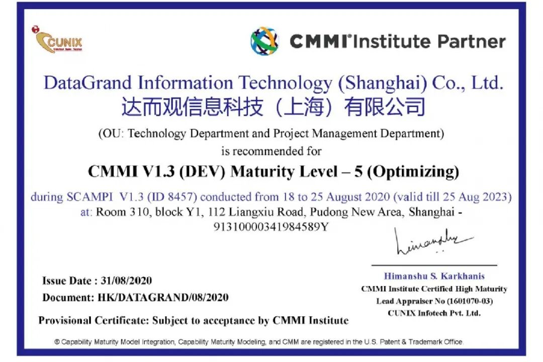 取得CMMI5认证,是达观数据在软件领域的一次突破与成功,为达观数据未来的创新发展提供了强有力的条件。通过CMMI5高成熟度过程改进, 对提升项目管理质量、研发管理能力、增强量化管理及过程改进能力都有至关重要的作用,也意味着达观数据可更大程度上提高产品的交付质量和客户满意度。