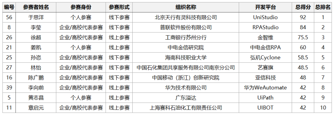 2021「RPA极客挑战赛」前10名获奖选手如下: