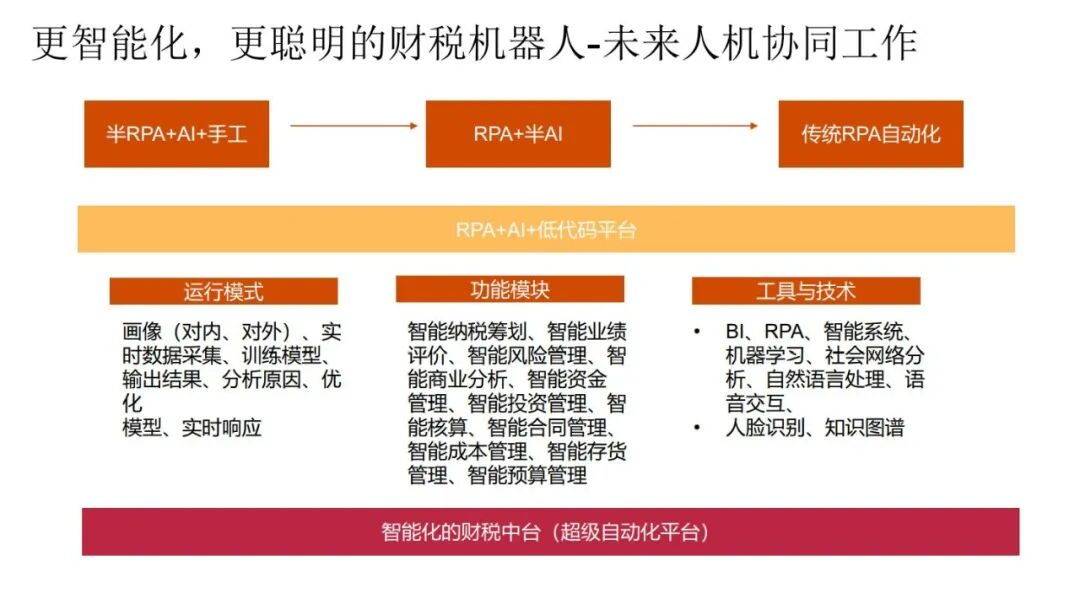 谈及超级自动化在财税领域的应用,虞佳表示,未来更多的是人机协同工作。智能化的财税中台需要RPA+AI+低代码平台的赋能,这个当中包括了三种模式,第一种是运行的模式,包括数据的采集,训练,输出,原因分析等。第二种是业务上的功能的模块,包括智能纳税筹划、智能业绩评价等。第三种是技术的支撑,包括BI、RPA、智能系统、自然语言处理等工具与技术。从趋势来看,在比较大的企业级RPA项目中,目前阶段采用的均是半RPA+AI+手工的形式,未来将逐渐过渡到RPA+AI+自动化的模式。