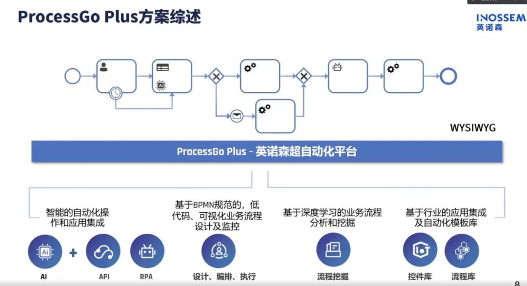 Robin介绍道,英诺森针对超级自动化的演进方向,推出了ProcessGo Plus解决方案,并且具备了超级自动化的基础特征。包括1、智能的自动化操作和应用集成能力;2、基于BPMN规范的、低代码、可视化的业务流程设计、编排、执行能力;3、基于深度学习的业务流程分析和挖掘能力;4、基于行业应用集成及自动化模板库。