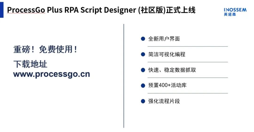7月28日,由英诺森、RPA中国联合举办的“超级自动化平台,ProcessGo Plus赋能组织新动能”线上峰会成功举行。(扫码文末二维码可回看本次会议)会议期间,英诺森ProcessGo Plus UI自动化社区版重磅发布,用户可直接登录ProcessGo官网下载,成功注册后即可免费获取试用版软件,并且可永久使用。