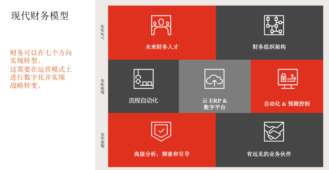 虞佳表示,财务转型是因为全球社会和商业环境快速变革的趋势冲击着传统财务,迫切需要财务能够以更高水准的来支持业务发展。这就进一步要求对财务的角色和功能性进行定位重塑。未来的财务将表现为三个特征:1、架构将变得与现在大不相同并且将大幅提升运转效率;2、更加高效,财务的角色定位将追逐价值导向;3、通过财务运作架构转型,财务职能将会更加高效。