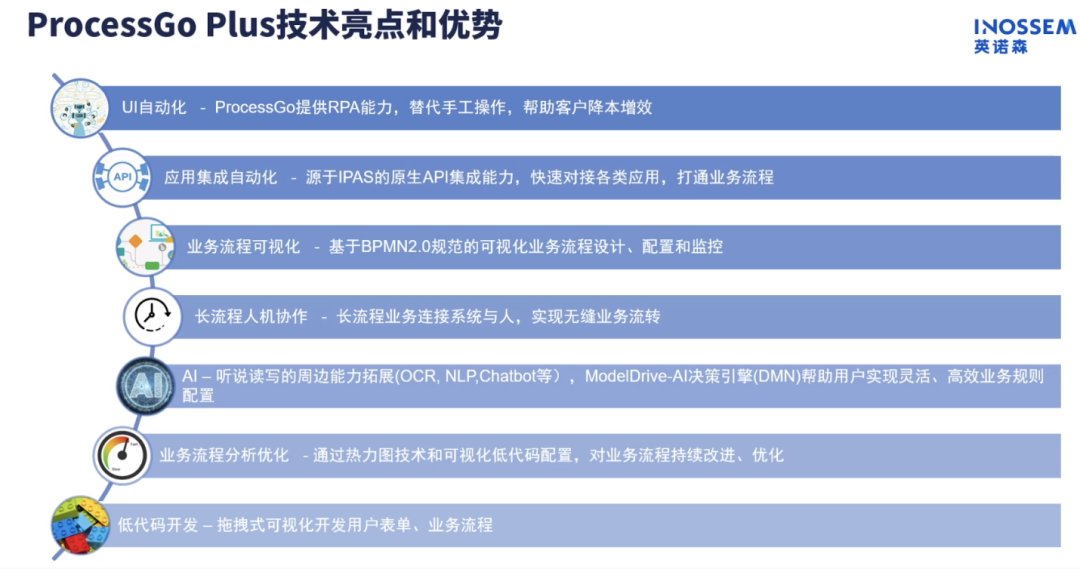ProcessGo Plus的优势主要包括:UI自动化、应用集成自动化、业务流程可视化、长流程人机协作、AI能力、业务流程分析优化、低代码开发。
