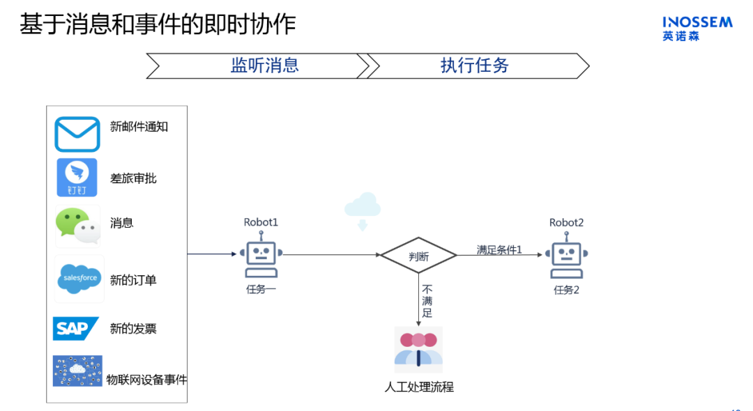 基于消息和事件即时协作功能,可以进一步提升自动化效率,将人从繁琐的业务中解脱出来。鄂晓翔指出,一般UI自动化需要人来手工发起,这种模式不能完全把人解放出来,也不能保证流程执行的即时性。而基于消息和事件即时协作功能,完美解决了这一业务痛点。例如,用户收到一封邮件、产品通过审批、新消息,都是可以作为机器人启动流程的触发条件,使得机器人变得更加智能,从而进一步释放员工时间,提升自动化业务流程的连贯性。