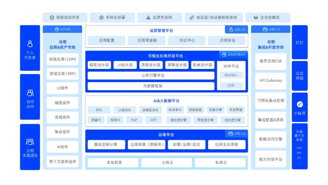 基于这个理念,奥哲推出了云枢低代码平台的升级版本。云枢是一款面向专业开发者的数字化引擎,旨在帮助企业打造敏捷好用的数字化综合能力复用平台即业务中台。云枢通过敏捷构建企业业务应用,快速响应用户需求,连接企业上下游,帮助企业实现业务在线、数字化经营,推动企业核心运营能力的变革和升级。