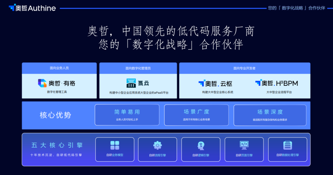 朱鹏喜介绍道,奥哲拥有五大核心自研能力,包括自研的业务模型引擎、流程引擎、逻辑引擎、页面引擎、数据处理引擎。在技术方面,奥哲做了大量投入,推出的四款产品基本覆盖了大中小客户群体。很多行业觉得低代码做一些轻量级业务比较容易,从奥哲的研究来看,复杂业务也可以通过低代码来做支撑。