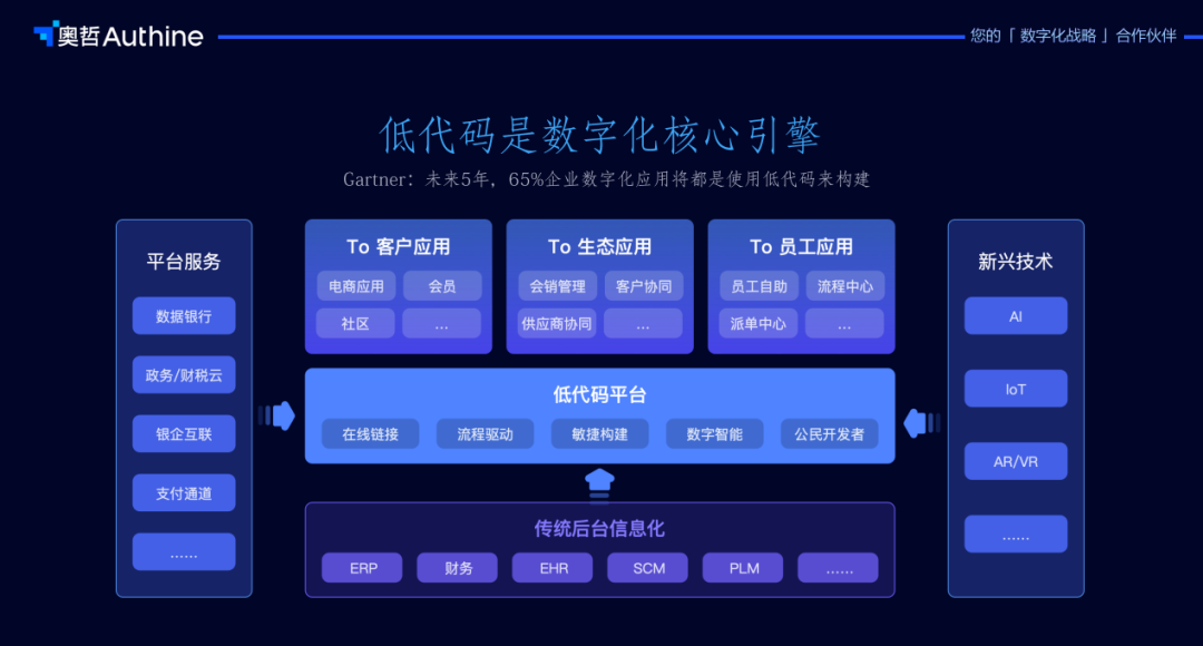 在低代码平台这块,奥哲既可以打通现有的各个系统,又可以通过平台之间的敏捷构建能力,构建各种各样的面向整个生态的上下游,比如供应商、渠道商、经销商生态相关的应用,或者企业内部的相关应用,低代码也会整合很多新兴的技术,支撑应用的快速构建。