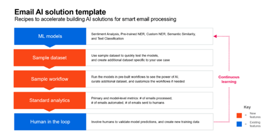 以电子邮件 AI模板为例,该模板提供了关于电子邮件自动处理所需的一切解决方案,包括,检测电子邮件中的意图、识别紧急和高价值电子邮件、提取重要信息等。