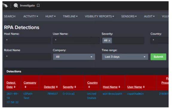在2021.10版本中,UiPath的机器人会向Crowd Strike报告关键端点检测信息,安全团队可以看到这些信息并在Crowd Strike仪表板上触发警报。这可以快速响应违规风险,改善人类和机器人劳动力的组织安全状况,有效防止非法操作的发生。