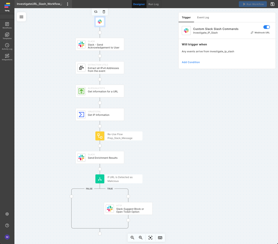 安全管理自动化机器人:Torq核心功能之一。用户可通过 Slack、Microsoft Teams或其他聊天工具创建交互式RPA机器人,用来收集数据、执行任务操作、业务审批或任何其他任务。例如,将安全信息上传至指定系统中。