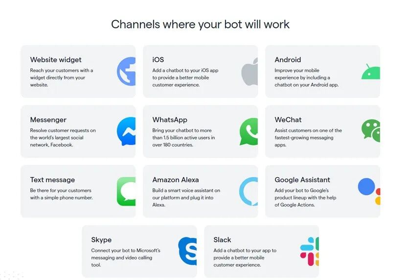 产品集成方面, Mindsay支持市面上所有主流聊天工具,例如,微信、WhatsApp、谷歌助理、Messenger、Skype、Slack等。客户服务平台方面,支持Zendesk、Salesforce、Genesys、Intercom、iAdvize等主流平台,可帮助用户将聊天机器人无缝集成在各种平台中。
