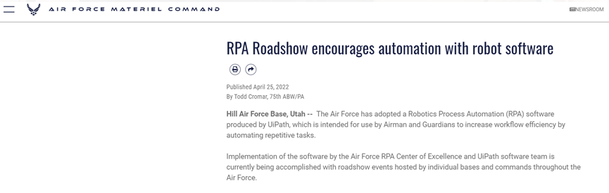 未经允许不得转载:RPA中国 | RPA全球生态 | 数字化劳动力 | RPA新闻 | 推动中国RPA生态发展 | 流 > 美国希尔空军基地举办“RPA路演”,鼓励各部门通过RPA实现业务自动化