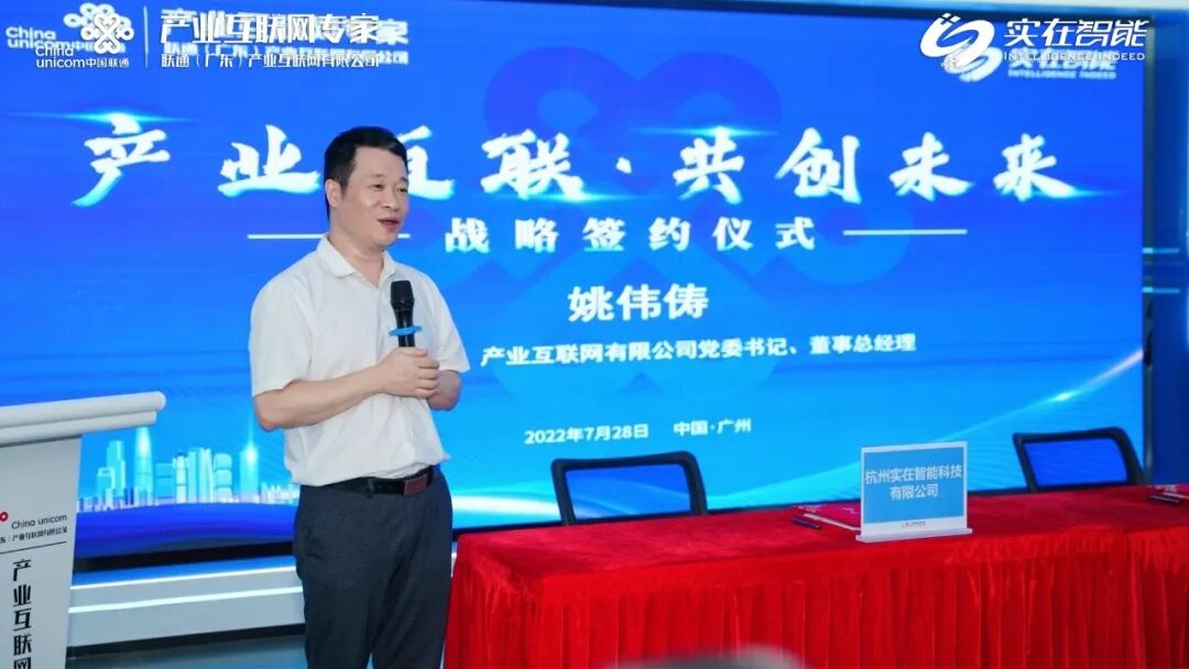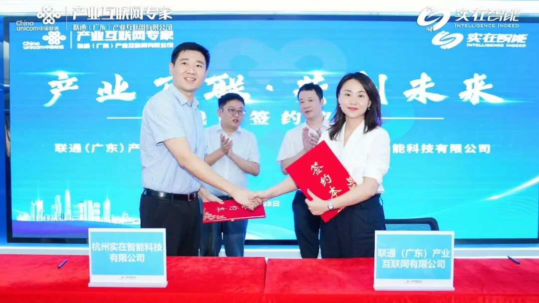 在联通广东产互党委书记、总经理姚伟俦及实在智能董事长、CEO孙林君的共同见证下,联通广东产互党委委员、副总经理王方和实在智能联合创始人、COO高扬代表双方签约。