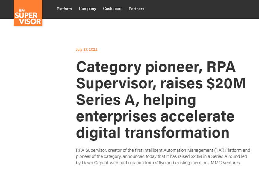 7月28日,RPA服务商Supervisor宣布获得2000万美元A轮融资,本次融资由 Dawn Capital 领投, s16vc和现有投资者MMC Ventures跟投。