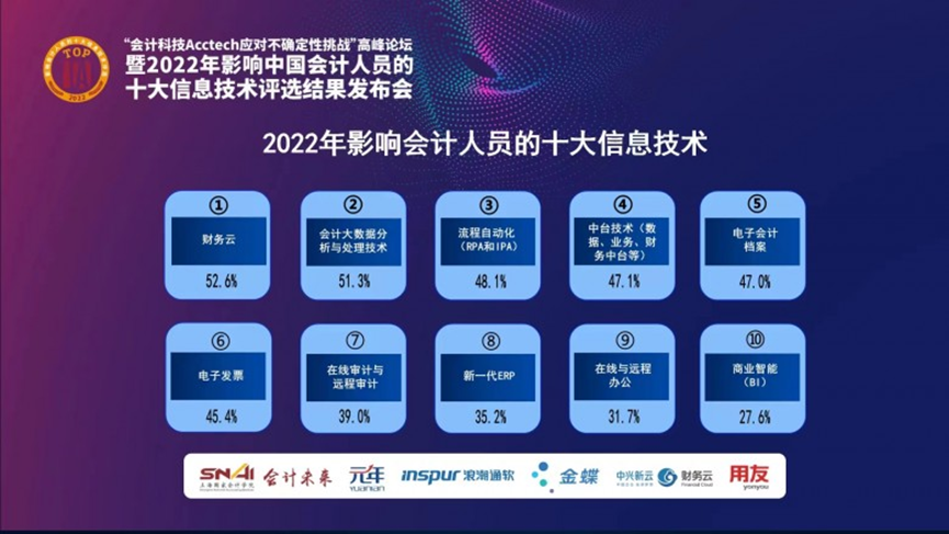 根据评选结果显示,2022年影响中国会计人员的十大信息技术分别是:财务云、会计大数据分析与处理技术、流程自动化(RPA和IPA)、中台技术(数据、业务、财务中台等)、电子会计档案、电子发票、在线审计与远程审计、新一代ERP、在线与远程办公、商业智能(BI)。