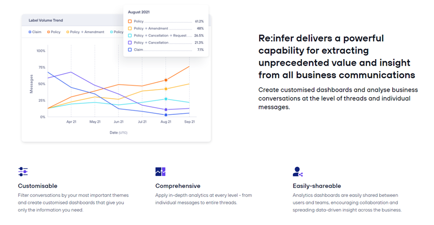 Re:infer是一家通过NLP技术提供通信挖掘(Communications Mining)的企业。根据Re:infer在官方博客的说法,通信挖掘的技术原理是通过NLP将通信消息转化为结构化数据,例如,通信的内容、频率、环境等,再通过智能挖掘分析数据提供业务流程视图,识别通信业务上的弊端和失败原因。因此,通信挖掘也是对话式智能自动化平台必备技术之一。