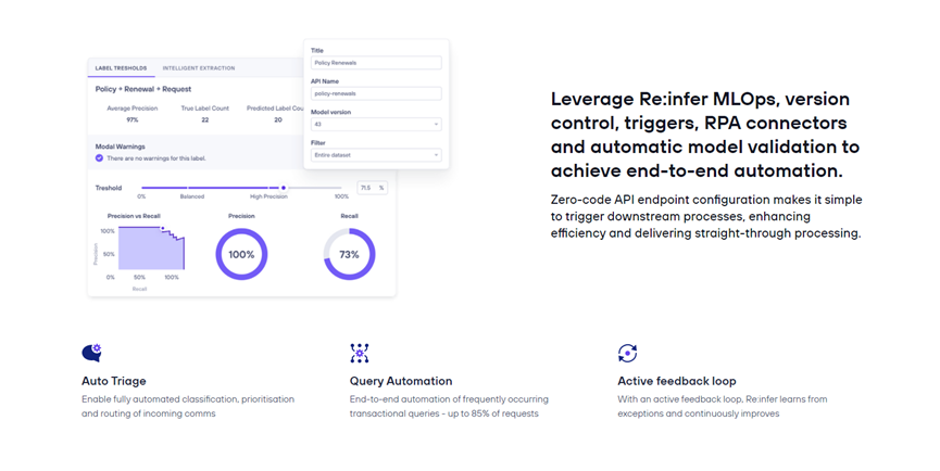 产品方面,Re:infer除了提供通信挖掘产品之外,还提供RPA连接器和自动模型验证来实现端到端自动化。