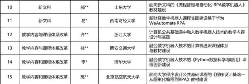 浙江大学申报的项目——计算机公共基础课中融入数字机器人技术的教学内容设计与实践。该项目旨在面向全校性计算机公共基础课,融入华为数字机器人(RPA+AI)技术内容与案例的教学与实践。