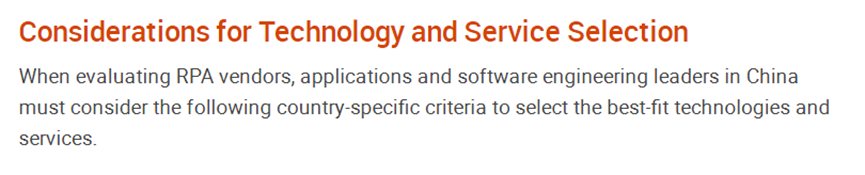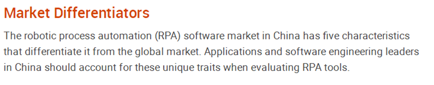 Gartner认为,中国的RPA软件市场有5个区别于全球市场的特点。中国的应用程序和软件工程领导者在评估RPA工具时应考虑这些独特的特征。