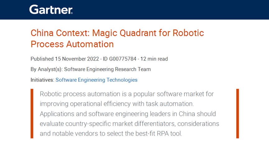 近日,全球著名信息咨询调查机构Gartner发布了中国“RPA魔力象限”,通过市场差异、技术和服务选择、发展趋势等维度对中国地区的RPA市场、供应商进行了综合评估。