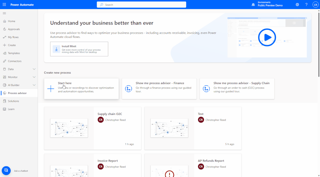 早在今年4月,微软收购了流程挖掘领导者Minit,以增强智能自动化能力。5月,在微软召开的“Microsoft Build 2022” 开发者大会上,宣布将流程挖掘功能集成在RPA产品中。现在,用户可以在Power Automate最新预览版本中使用流程挖掘。