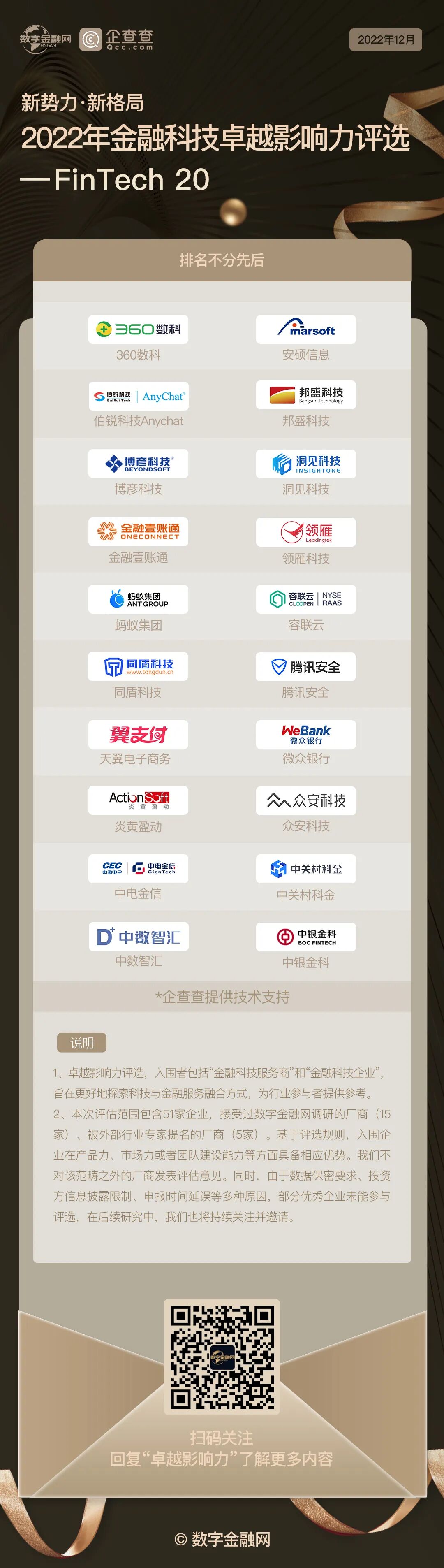 在此背景下,为了更好地了解中国数字金融科技发展现状和趋势,对优秀的市场参与者进行更为深入调研研究,数字金融网研究院发起 「新势力·新格局 2022年金融科技卓越影响力评选」,企查查提供技术支持,评选包括卓越影响力 FinTech 20、卓越服务商、卓越标杆案例三部分,各部分独立评选,互不影响。