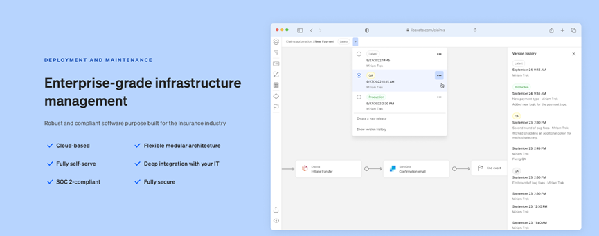 部署维护:专为保险领域打造的高安全性云平台。所有功能支持模块化配置,支持自主配置/维护,与客户IT系统深度集成,符合SOC 2数据标准等。