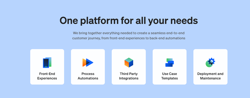 产品方面,Liberate的智能自动化平台主要由前端体验、流程自动化、第三方集成、用例模板库和部署维护5大块组成。