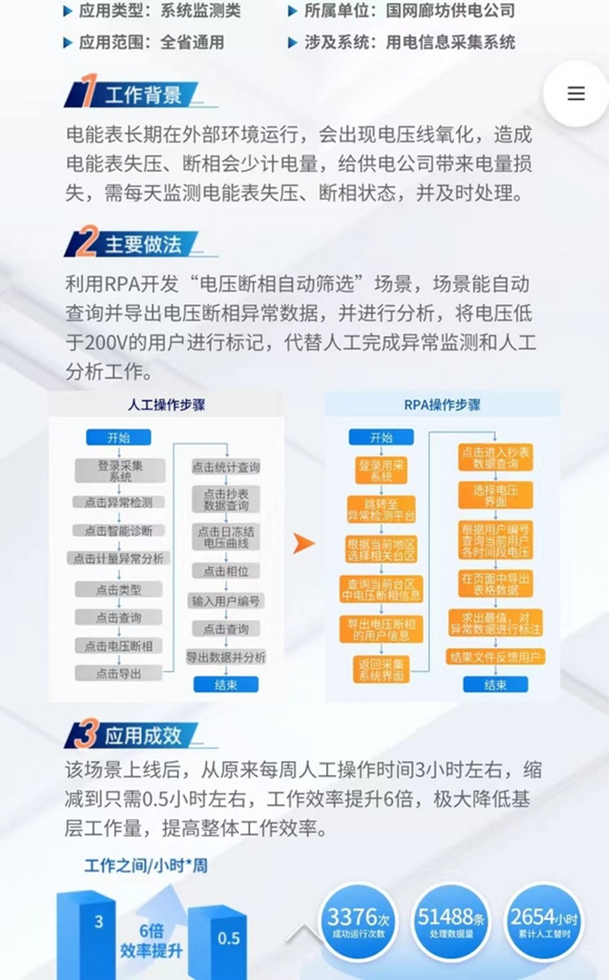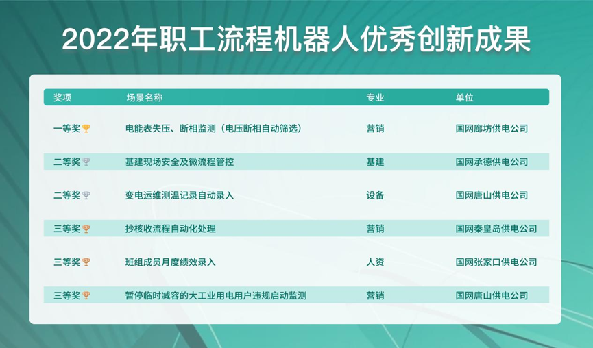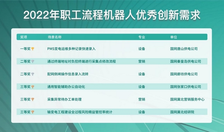 当前,国网冀北电力有限公司基于本次活动评选成果,完成2022年RPA应用成果案例集编制,共收录29个典型案例,覆盖营销、设备、数字化、人资、物资、后勤、基建、调控、运检、安监等10个专业,其中,营销、设备、基建专业各有1个应用成果入选国家电网2022年RPA应用优秀成果。