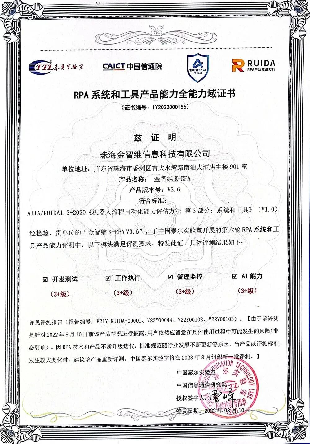 作为国内率先研发出企业级RPA的人工智能企业,近年来,金智维深度洞察行业数字化转型趋势,积极响应国家大力发展数字经济的号召,并不断加大研发投入,围绕数字政府、智慧金融等领域,将企业级RPA技术与业务场景进行深度融合,为企业、组织提供一站式数字员工整体解决方案。截至目前,金智维已成为首批获得中国信通院RPA系统和工具产品能力全能力域3+证书的RPA技术厂商,并获得包括CMMI 5级认证、等保三级认证在内的十余项技术认证,产品全面支持信创体系,已服务包括国有六大行在内的600多家大中型企业。