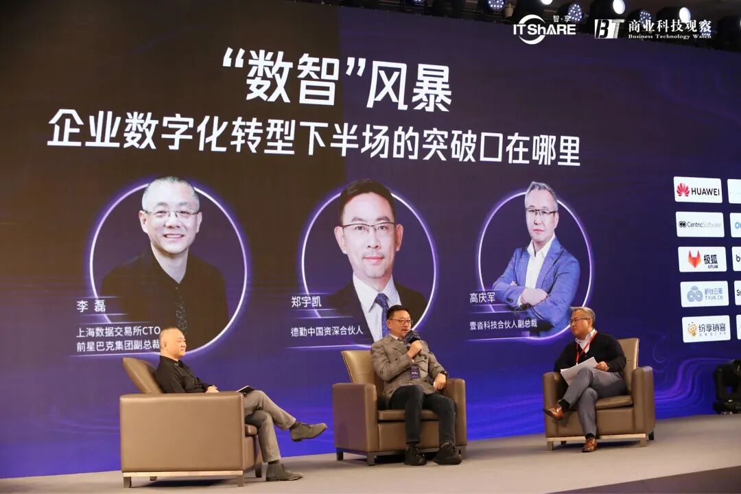 在大会开始前,由壹沓科技合伙人高庆军主持,和上海数据交易所CTO、前星巴克集团副总裁李磊,德勤中国资深合伙人郑宇凯一起,围绕“企业数字化转型下半场的突破口”,开启现场“数智风暴”。