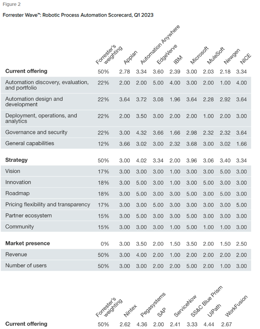 SAP:自Forrester上一次对SAP评估之后,其RPA产品获得了明显的进步,扩大了受众人群、自动赋能范围、技术创新、部署方式等。