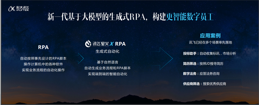 “基于星火认知大模型,RPA目前已在投标、简历、法务等多场景形成应用案例,同时考虑到个性化需求,我们也为专业RPA设计人员提供了流程节点调整能力。 ”刘庆峰说。