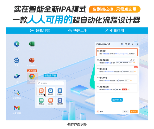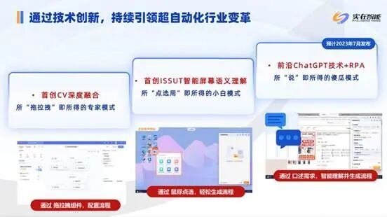 如果不能突破人人可用的壁垒,很难实现规模化运营,也会极大程度限制RPA的发展。实在IPA模式的出现不仅体现出国产RPA的创新性,更让“真正人人可用的RPA”成为可能。“无需拖拉拽,只需点选用”的流程构建直观易懂,在2022年底在行业首发推出,同时这一模式在业界(包括海外)是首创的。