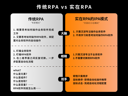 对于用户来说,使用RPA会面临拾取、元素、变量这三座大山。传统模式下的RPA用户如果想配置自动化操作,必须要先学会如何使用RPA软件,进而才能在RPA软件与业务软件之间不断切换,逐步以“拖拉拽”或“写代码”的方式,完成自动化流程配置,这就要先将使用者培训成专家,再去学习如何使用RPA产品。这对用户来说,天然就设定了一道门槛,跟人人可用有巨大差距。