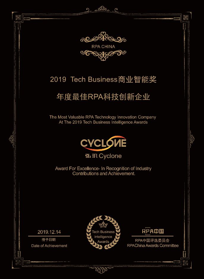 弘玑Cyclone,是“弘玑Cyclone数字员工”的简称,弘玑Cyclone数字员工不只是一种软件产品,而是与人工智能技术相融合,面向各行业的机器人流程自动化解决方案。拥有提升业务效率、提升员工价值、降低运营成本、无差别运行、非侵入式部署、支持无人值守等诸多优势。经过对弘玑Cyclone从产品特点、市场品牌、行业应用、科技创新等多个维度的深层评估,在此次大会中,弘玑Cyclone获得了由RPA中国颁发的“年度最佳RPA科技创新企业”大奖。