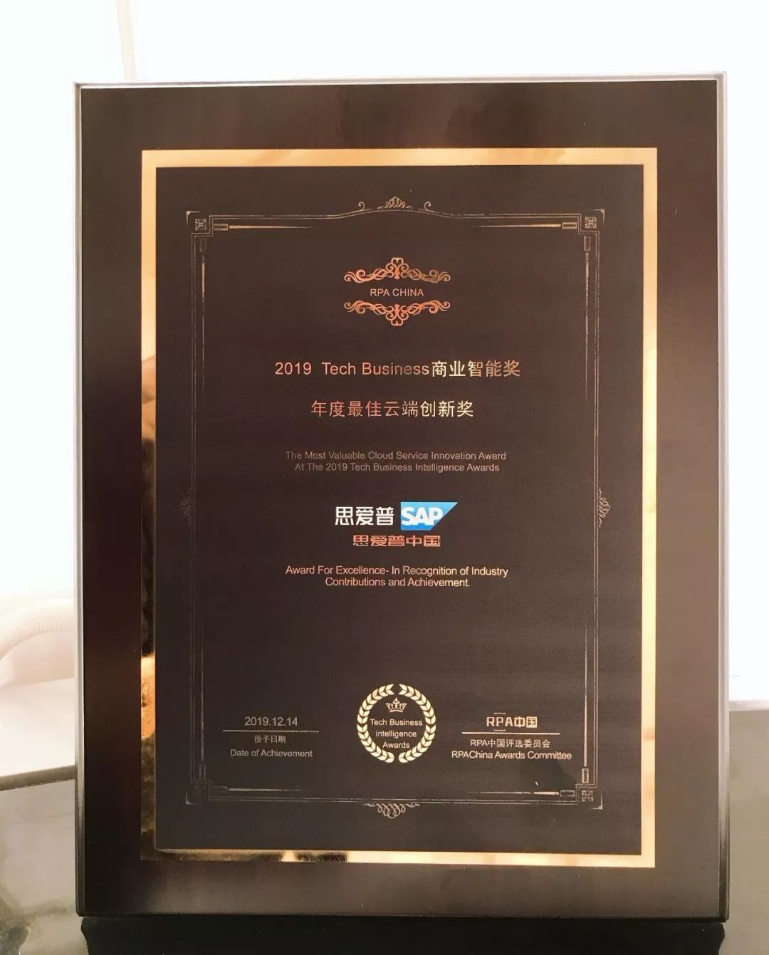 SAP 将人工智能技术与 RPA 结合,成功应用于企业的业务流程,全面提升了企业的生产力,在本次「RPA 中国2019 Tech Business 商业智能大会」上,荣膺「年度最佳云端创新奖」。